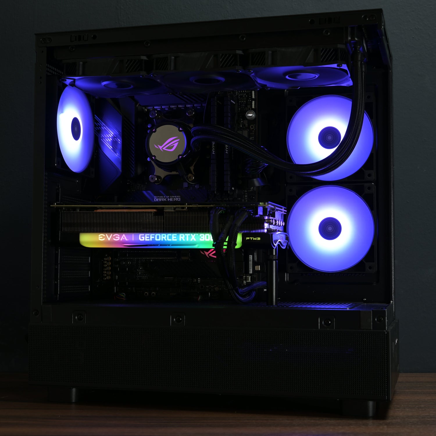 GPU GeForce RTX 3080 FTW3 ULTRA je osazena ve skříni Montech XR Black a chlazena výkonným vodním chladičem ASUS ROG STRIX LC III 360. Tato kombinace poskytuje stabilní výkon i při dlouhodobé vysoké zátěži, velmi nízké provozní teploty a tichý chod sestavy. Chlazení je plně dimenzované pro výkonný procesor Ryzen 9 5900X i grafickou kartu RTX 3080.